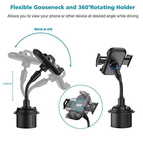 Best Driving Assistant for you - Our 8.26" car cup phone holder comes with a flexible neck (about 2.56inch) and 360° rotatable phone mount, letting you can enjoy safe and the best viewing angle whether you are talking, navigating, listening to music or charging. Don't need to affix anything to your dash or window, just simply put it in your car cup holder and fix. ( *NOTE: to enjoy a better experience, we would suggest you to fix the base into cupholder first and then install the phone holder* )