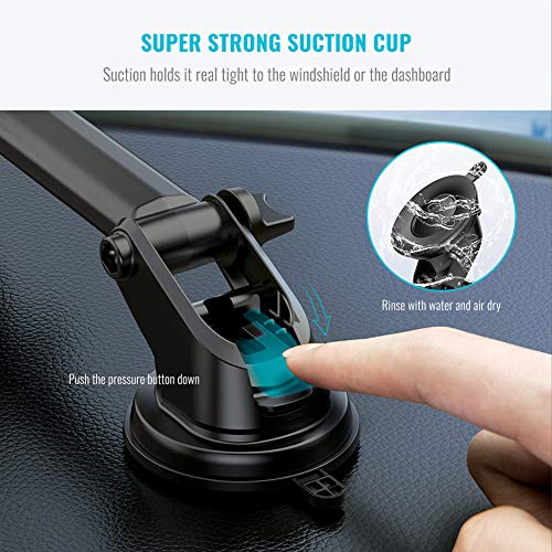 Super Strong Suction Cup: Washable suction cup sticks securely on your dashboard or windshield even on a bumpy road and is easily removable. It also features a second locking mechanism for extra secure holding by pressing the pressure button down. NOTE: It is not recommended to apply the dashboard car mount on any leather dash surfaces as this suction pad is designed with strong viscosity.