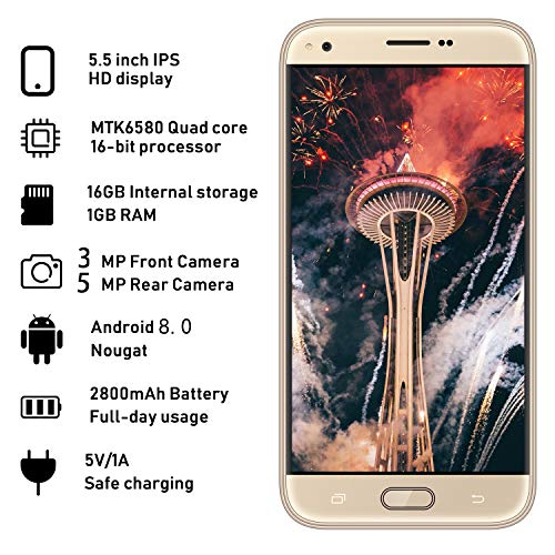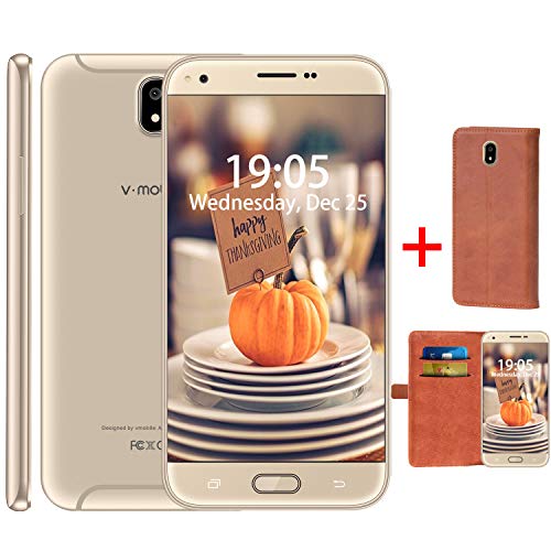 V Mobile J5 Dual SIM Unlocked Cell Phones, 5.5 inch HD, Quad Core 16GB ROM, Android 8.0, 8MP Face ID Unlocked Smartphone, Compatible with ATT, T-Mobile, Cricket, Metro PCS Other GSM Carriers